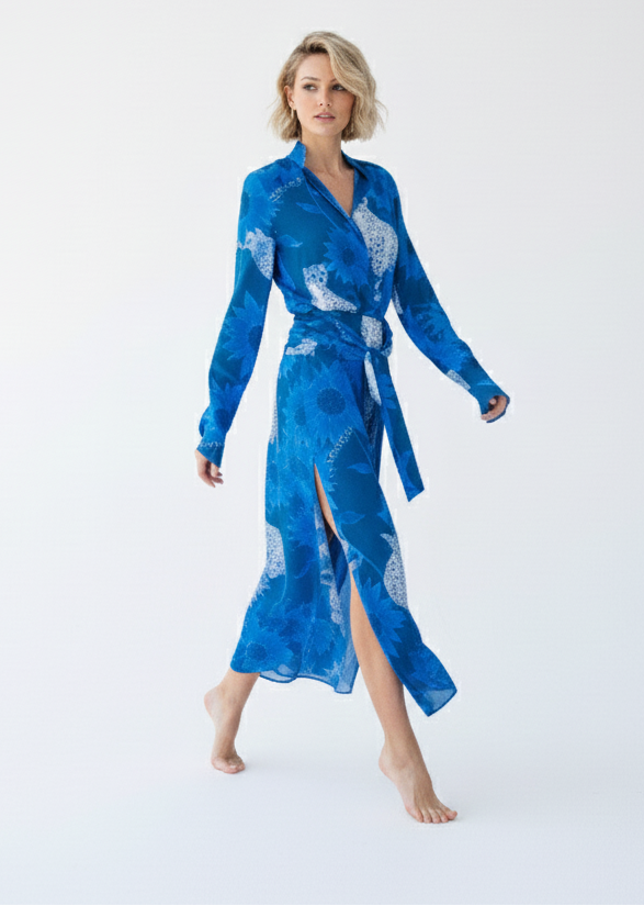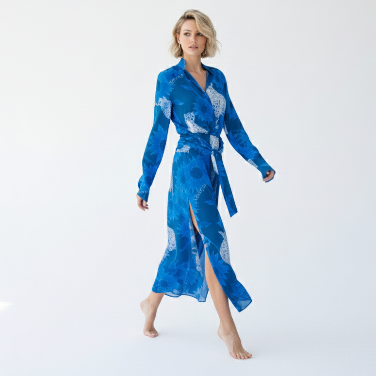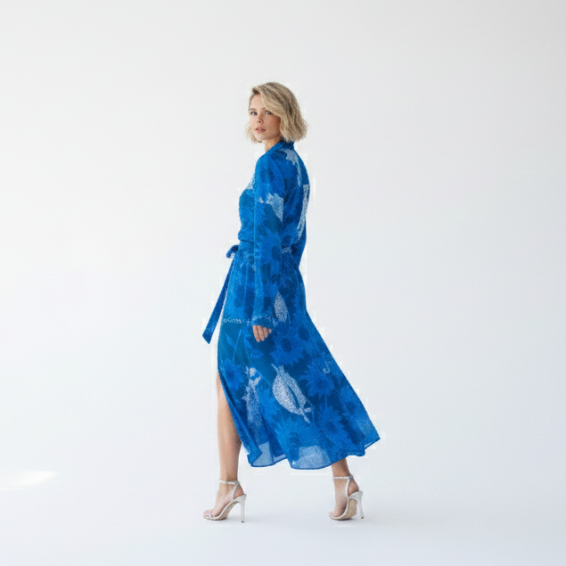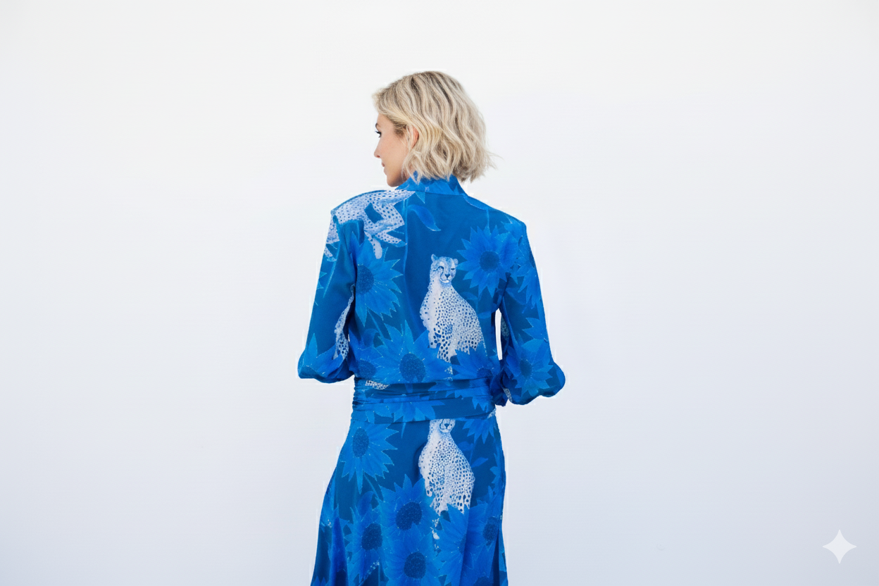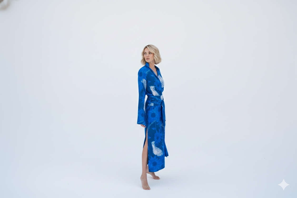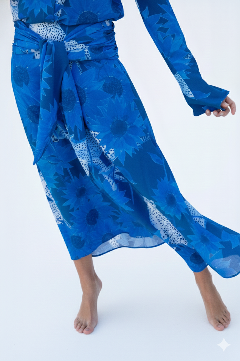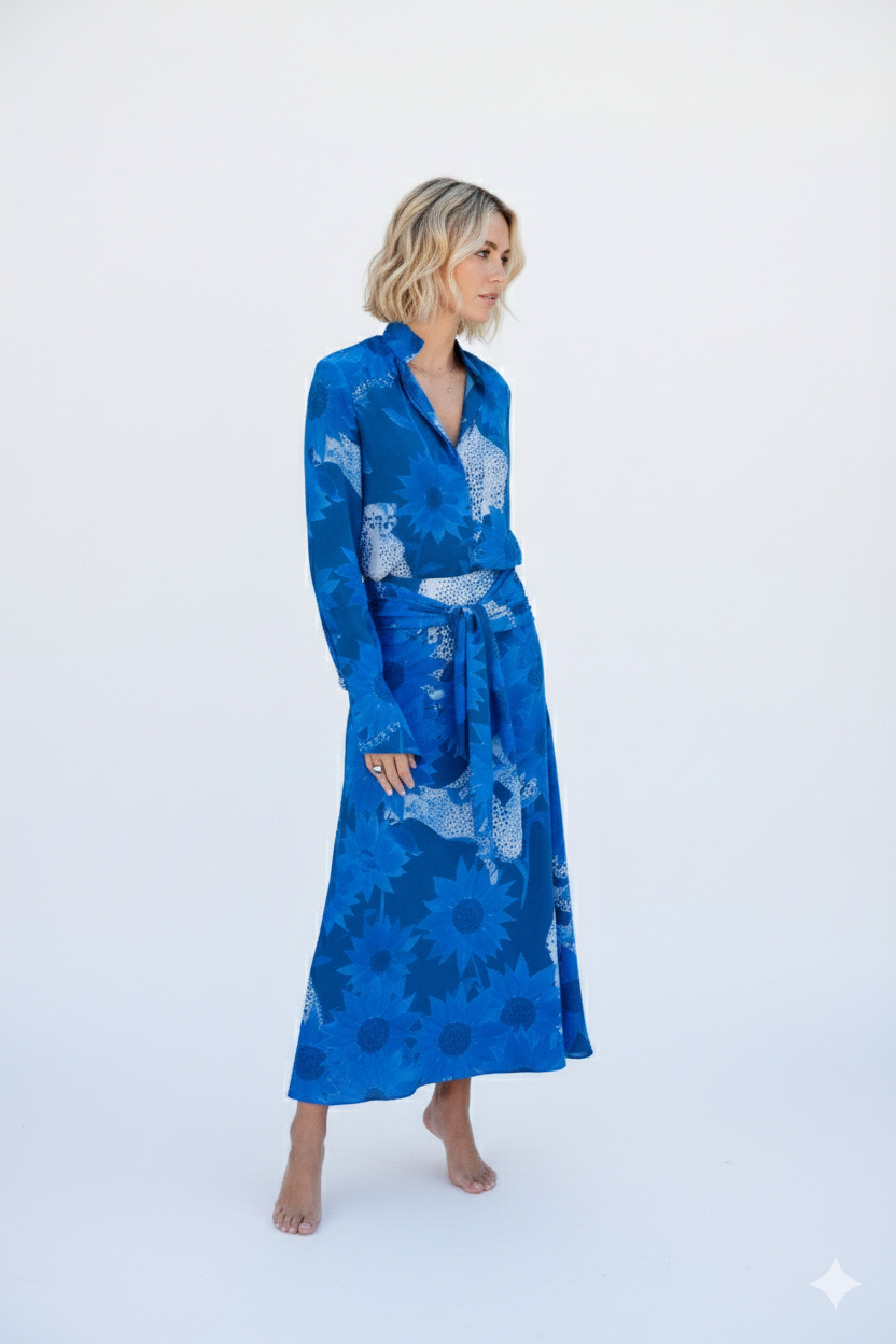 El conjunto Seto recibe su nombre del mar interior de Seto, en Japón, evocando serenidad y equilibrio en cada detalle. La camisa, con su cuello mao y puños acampanados, se combina a la perfección con la falda midi, que destaca por su abertura lateral y su fajín plisado extraíble, ofreciendo una mezcla única de sofisticación y versatilidad.